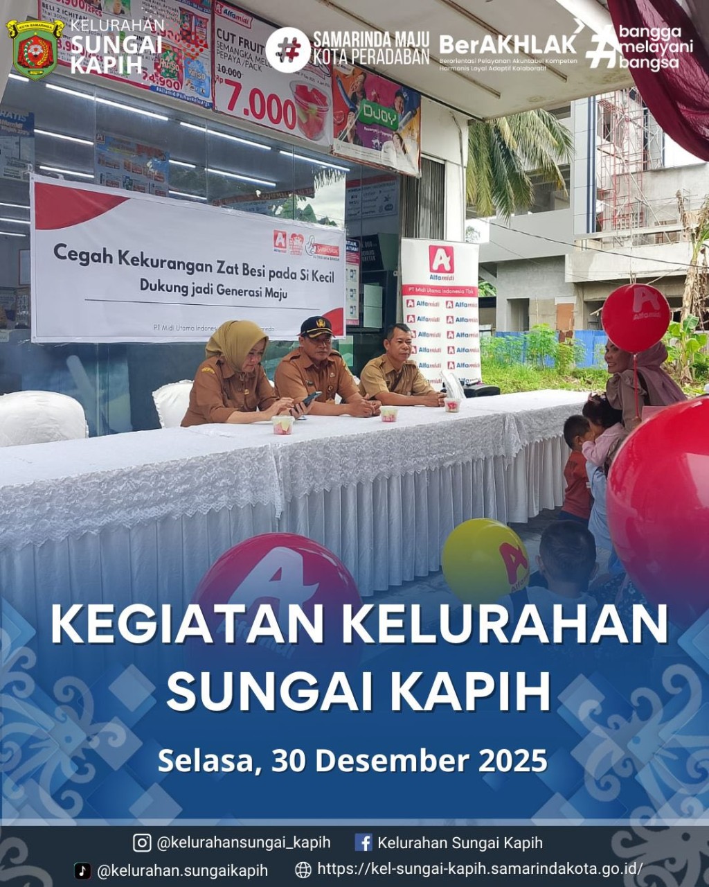 Kegiatan Kelurahan Sungai Kapih, Selasa 30 Desember 2025 January 22, 2026 Menghadiri sosialisasi dukung kekurangan zat besi pada si kecil dukung generasi maju pelaksana alfamidi lokus jl kapten soedjono sungai kapih Shift piket harian staf di kantor kelurahan lama jl tatako sungai kapih Staf menerimakan kekurangn bantuan pohon buah mangga seb...